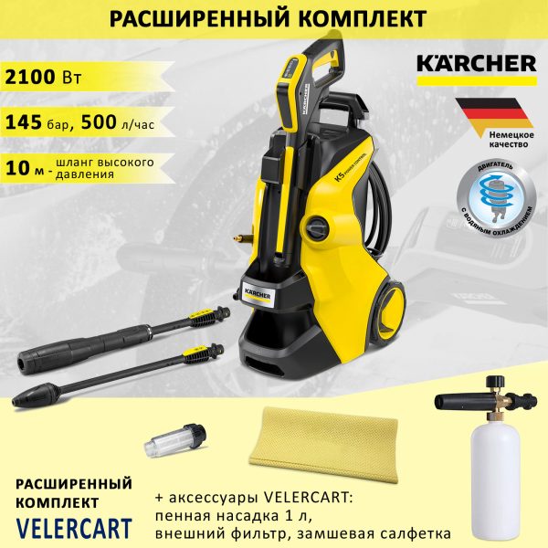 Karcher K 5 Power Control - мойка высокого давления бытового класса производительностью 500 л/ч. Это расширенная версия с качественными аксессуарами VELERCART. Мойка предназначена для удаления загрязнений высокой интенсивности. Идеально подходит для мойки автомобилей, инструмента, садовой мебели, а также для чистки каменных стен и террас.