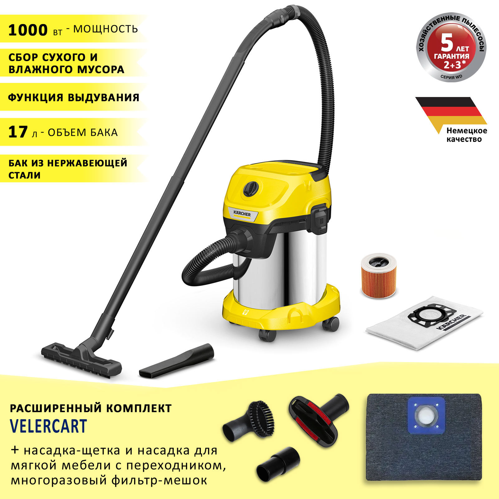 Karcher WD 3 S V-17/4/20 - хозяйственный пылесос мощностью 1000 Вт со стальным контейнером на 17 л для уборки сухого и влажного мусора. Подходит для чистки салона автомобиля, уборки на садовом участке, в гараже, в мастерской, на входе в дом и т.д. Версия с расширенной комплектацией.