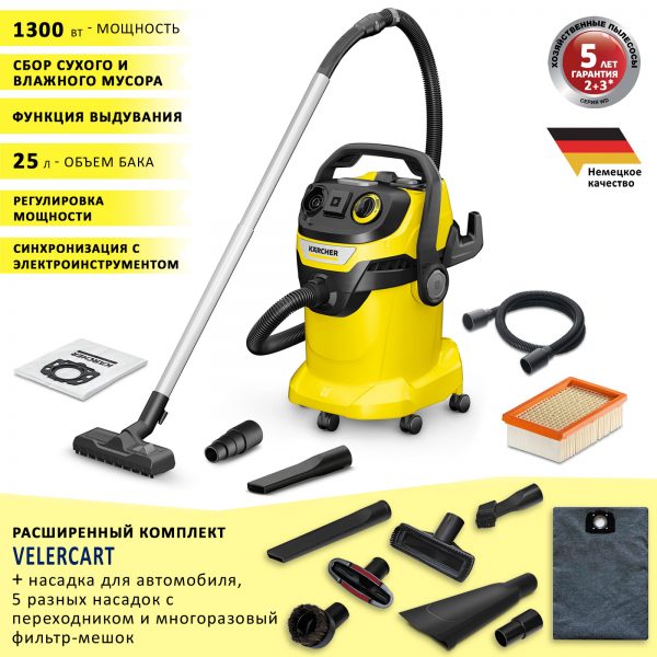 Karcher WD 5 S V-25/5/22 - многофункциональный хозяйственный пылесос экстра-класса. Предназначен для уборки, как сухого мусора, так и влажных загрязнений. Пылесос идеально подходит для уборки салона автомобиля, гаража, мастерской, подвала, наружной территории помещений и пр. Это версия с расширенной комплектацией!