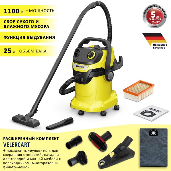 Мощный и энергоэффективный хозяйственный пылесос Karcher WD 5 V-25/5/22 для быстрой и эффективной уборки автомобиля, в гараже, помещений после ремонта. Впечатляет превосходными результатами сбора любого мусора – крупного и мелкого, сухого и влажного. Плоский складчатый фильтр позволяет чередовать влажную и сухую уборку без перерыва на его замену. Это версия с расширенной комплектацией.