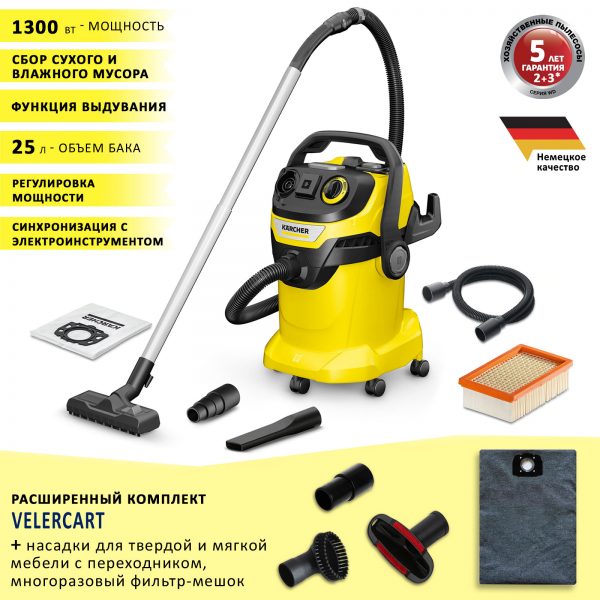 Karcher WD 6 P V-25/8/22/T - многофункциональный хозяйственный пылесос экстра-класса с пластиковым баком на 25 л. Может использоваться для уборки как сухого мусора, так и влажных загрязнений на придомовой территории, в саду, в подвале и в гараже, в мастерской (при работе с электроинструментами), в салоне автомобиля и пр. Это версия с расширенной комплектацией.